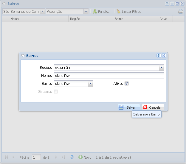 Para adicionar um novo bairro deve-se selecionar o botão Novo, com isso abrirá uma nova tela, onde o usuário deve preencher o nome e associar com um bairro(Conforme a imagem abaixo). O campo ativo deve ser preenchido se a empresa for trabalhar com dados deste bairro(Imóveis e captação), se a empresa não desejar receber imóveis deste bairro, pode-se ir no cadastro de bairros e desmarcar a opção ativo. Após o procedimento basta clicar no botão Salvar para incluir o bairro desejado.