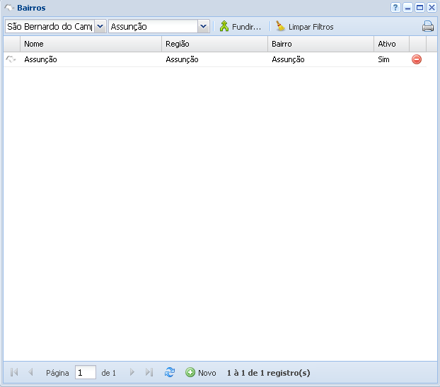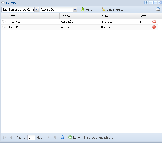 Após a inserção do bairro no sistema, ele ficará disponível na tela de bairros, conforme a imagem abaixo. É possível dar duplo clique para editar/excluir o bairro. Você também pode excluir o bairro no ícone de negativo, em vermelho, do lado do campo ativo.