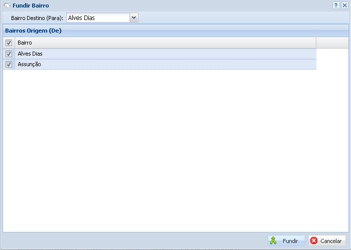 A tela de Fundir bairros fica na parte superior da tela de bairros. Ela serve para juntar imóveis de dois bairros para um só, excluindo o outro bairro do sistema. Geralmente utilizada quando existem dois bairros iguais cadastrados com algum tipo de caractere diferente.
