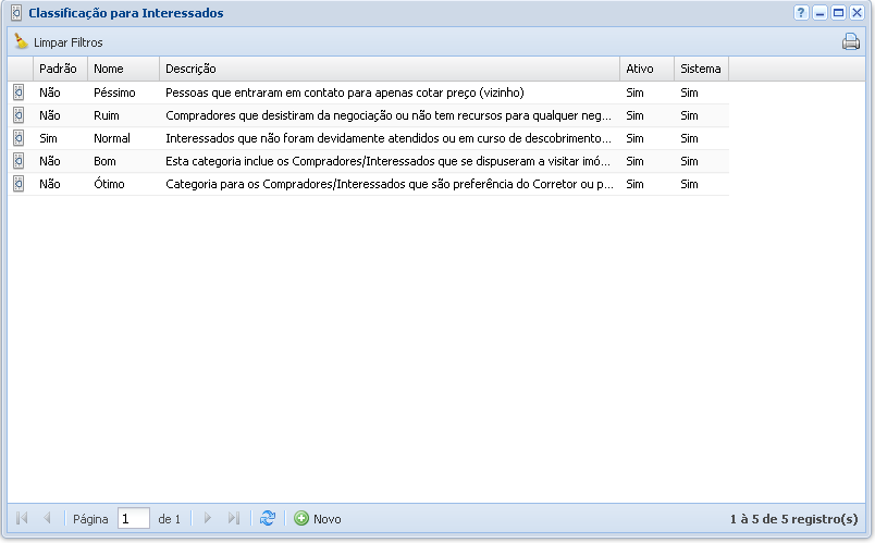 Neste menu é possível visualizar e adicionar novas classificações para os interessados, útil para classifica-los ao cadastrar no sistema e para um melhor controle do corretor.
