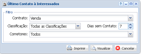 Na filtragem o sistema permite que se escolha por tipo de Contrato, Classificação do Interessado, Dias sem contato e Corretores, conforme a preferência do usuário.