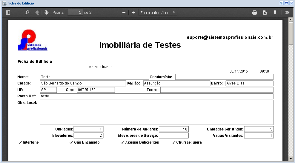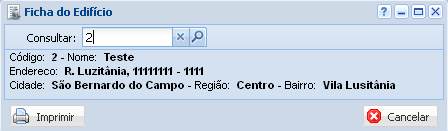 O sistema irá carregar as informações básicas do edifício como o código, nome , endereço e os dados da Cidade, Região e Bairro, conforme a imagem abaixo mostra. Para verificar uma ficha mais completa, basta clicar no botão “Imprimir“.