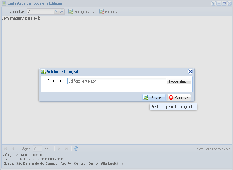 Após consultar o Edifício desejado, clique no botão Fotografias… ao lado do mecanismo de pesquisa. Ao acionar este botão, irá abrir uma nova tela no sistema para você escolher a fotografia que deseja. Após o processo, basta clicar no botão Enviar.