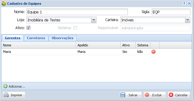 Para cadastrar os gerentes e corretores clique em sua respectiva aba e em seguida no botão Adicionar. Para observações, clique em sua aba e digita a observação que deseja sobre esta equipe.