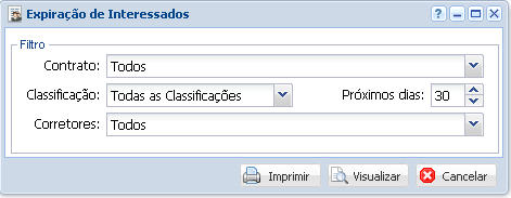 Na filtragem o sistema permite que se escolha por tipo de Contrato, Classificação do Interessado, Corretores e Próximos dias (Neste campo insira a quantidade dos dias que deseja verificar a expiração de interessados).