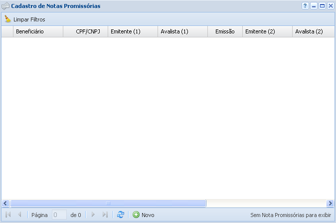 Para fazer o cadastro de uma nova nota promissória, clique em Novo.