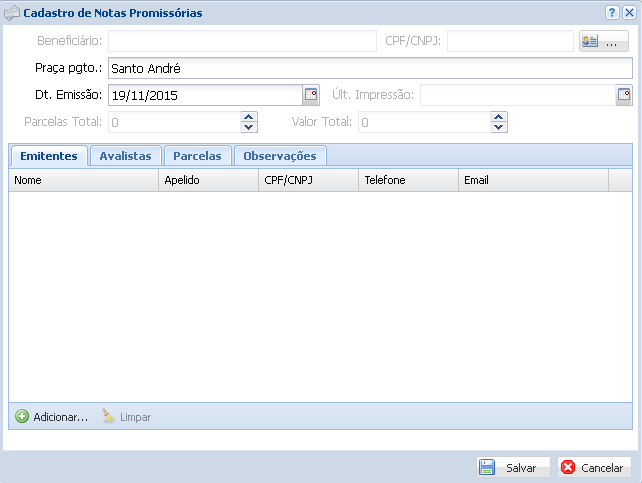 Esta tela permite cadastrar e imprimir notas promissórias, lembrando que o sistema não faz controle de cobrança das notas.