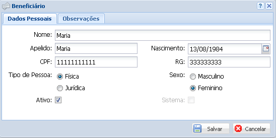 Para cadastrar o beneficiário, clique em Editar Beneficiário (botão ao lado direito do menu CPF/CNPJ).