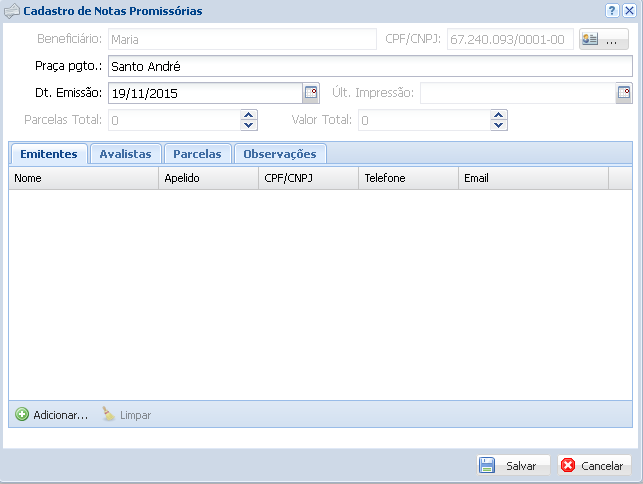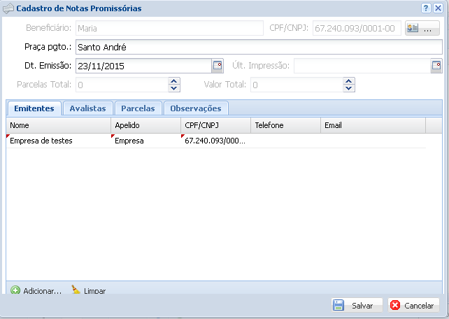 Feito o cadastro do beneficiário será necessário cadastrar o Emitente (devedor da nota), para isso clique em Adicionar.