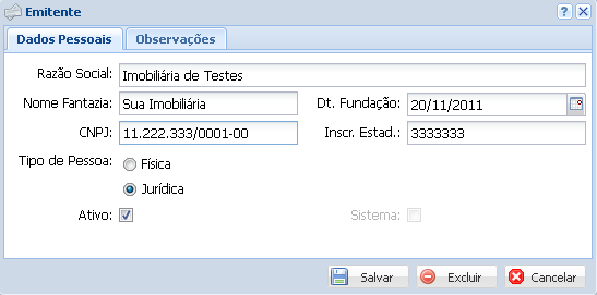 A seguir insira os dados do emitente da nota e clique em Salvar.
