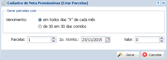 Ao abrir a tela para o cadastro das parcelas, será encontrada as seguintes informações: Tipo de Vencimento podendo ser Vencimento de 30 em 30 dias a partir da Data atual (02/03, 01/04, 01/05, ETC), e Vencimento todo dia X de cada Mês (23/11/2015, 23/12/2015, 23/01/2016, etc), ao escolher a melhor opção de cobrança, insira a quantidade da parcelas, o primeiro vencimento e o valor de cada parcela.