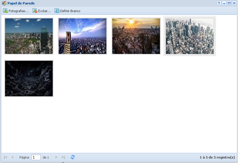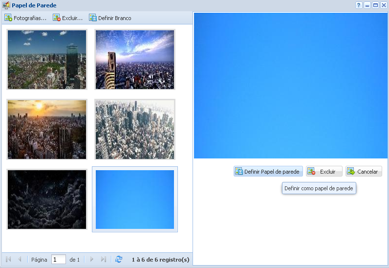 Esta tela permite incluir um papel de parede para a utilização do sistema. O botão Excluir serve para deletar a fotografia desejada do sistema. E o botão Definir Branco, reverte o papel de parede atual para um fundo todo branco.