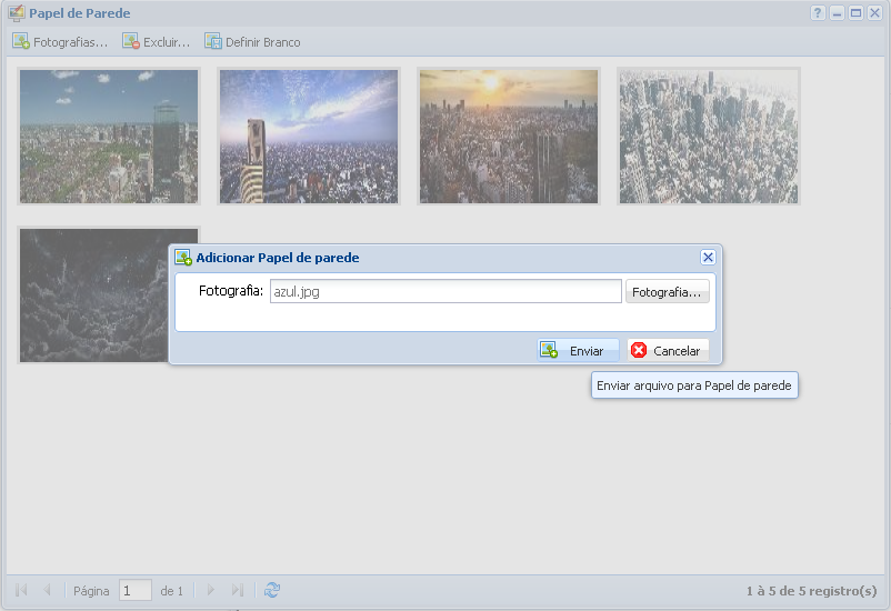 Para cadastrar um papel de parede basta selecionar uma imagem do seu Computador para o sistema. Para incluir a foto desejada basta clicar no botão Fotografias…, que abrirá um campo menor (conforme a imagem abaixo). Após isso basta clicar no botão Fotografia… na caixa menor, selecionar a foto desejada em seu computador e apertar o botão Enviar. Caso não deseje mais realizar o procedimento, basta clicar no botão Cancelar.