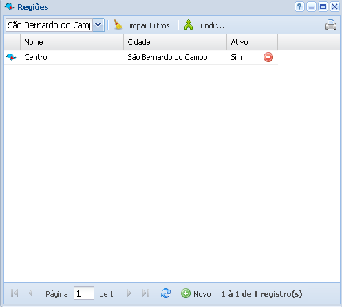Após a inserção da região no sistema, ela ficará disponível na tela de regiões, conforme a imagem abaixo. É possível dar duplo clique para editar/excluir a região. Você também pode excluir a região no ícone de negativo, em vermelho, do lado do campo ativo.