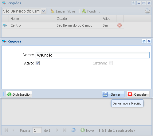 Para adicionar uma nova região deve-se selecionar o botão Novo, com isso abrirá uma nova tela, onde o usuário deve preencher o nome da região, (Conforme a imagem abaixo). O campo ativo deve ser preenchido se a empresa for trabalhar com dados desta região(Imóveis e captação), se a empresa não desejar receber imóveis desta região, pode-se ir no cadastro de regiões e desmarcar a opção ativo. O botão Distribuição será utilizado quando uma região apresentar pelo menos 3 imóveis cadastrados,com isso ele pegará os pontos extremos e selecionará uma área no mapa da cidade, onde estes imóveis estão concentrados.Após o procedimento basta clicar no botão Salvar para incluir a região.