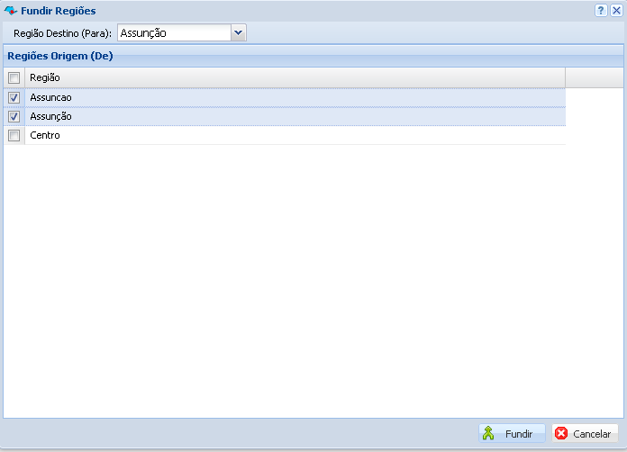 A tela de Fundir regiões fica na parte superior da tela de regiões. Ela serve para juntar imóveis de duas regiões para uma só, excluindo a outra região do sistema. Geralmente utilizada quando existem duas regiões iguais cadastradas com algum tipo de caractere diferente.