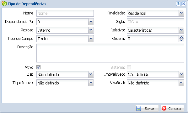 O sistema abrirá uma nova janela para cadastro onde deverão ser preenchidos o Nome, Finalidade, Dependência Pai (Caso ela esteja inserida ou relacionada com alguma dependência. Exemplo: Suíte – Dependência Pai: Dormitórios), Sigla, Posição (Onde esta dependência se encontra), Relativo, Tipo de Campo, Ordem, Descrição e se está Ativo.