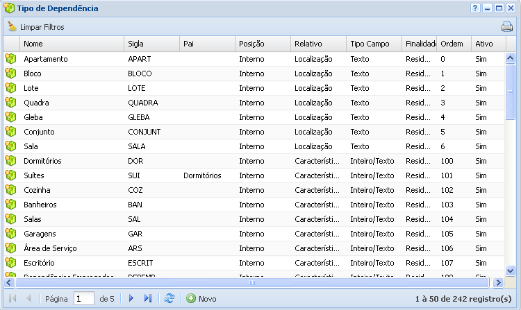 Na tela inicial o sistema apresenta os tipos de imóveis cadastrados, suas Siglas, Dependência Pai, sua Posição, Tipo de Campo, Finalidade, Ordem e se está Ativo.