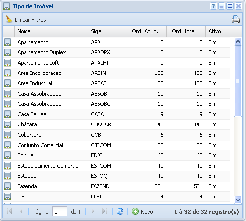 Na tela inicial o sistema apresenta os tipos de imóveis cadastrados, suas Siglas, a Ordem de Anúncio, Ordem de Internet e se o contrato se encontra Ativo.