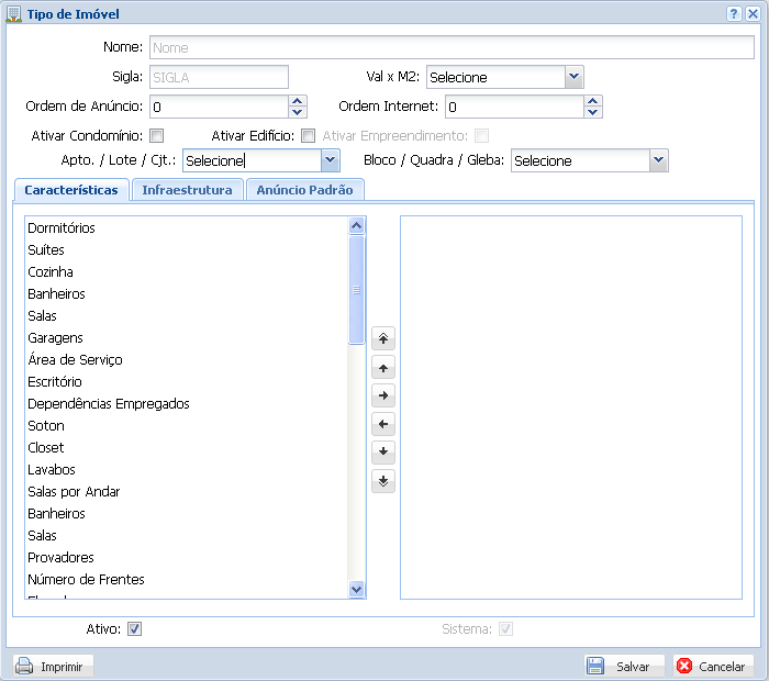Na aba “Características” e “Infraestrutura” é permitido que o usuário inclua as informações deste tipo de imóvel, bastando clicar em cima e depois na seta apontando para o lado direito. Na guia “Anúncio Padrão” o usuário pode digitar um anúncio padrão para este tipo de imóvel