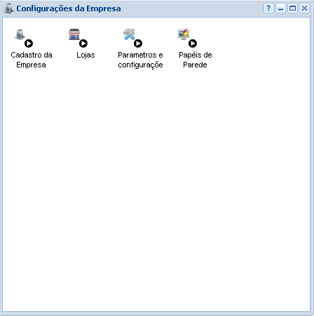 A tela de Configurações da Empresa é a página principal, utilizada para acessar quatro menus diferentes: Cadastro da Empresa, Lojas, Parametros e Configurações e Papéis de Parede.