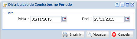 Inicial/Final: Data inicial para o relatório buscar as comissões. Qualquer comissão a ser distribuída dentro deste período irá aparecer.