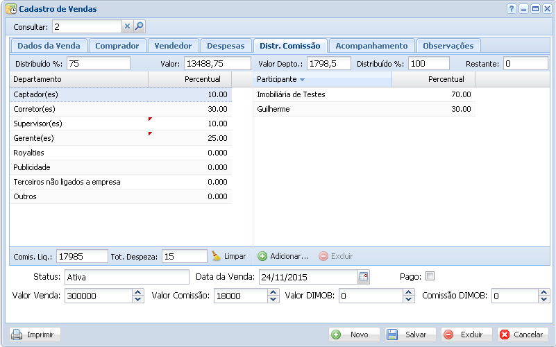 Em Distr. Comissão definimos o quanto será dividido em comissões pelo valor total da comissão da Imobiliária.