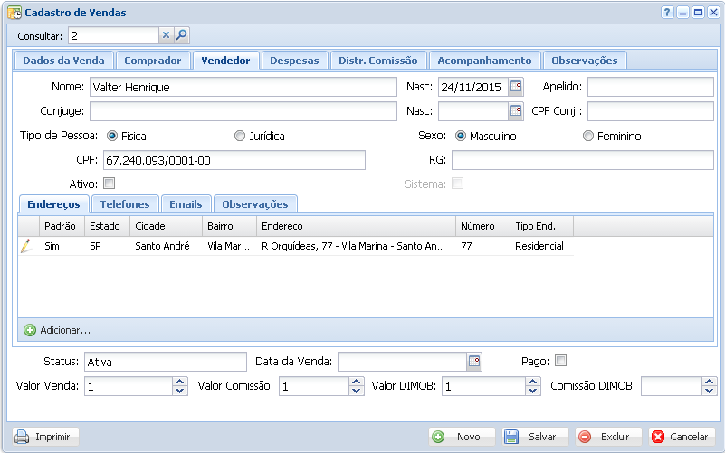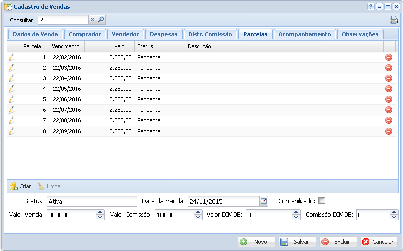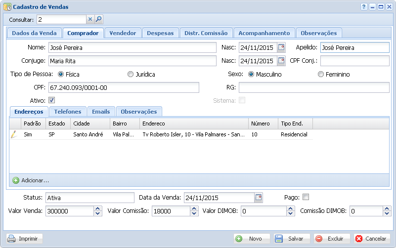 Esta tela nos permite registrar vendas que foram efetuadas pela empresa, envolvendo o imóvel, um comprador/locatário e um vendedor/locador.