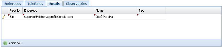Abaixo temos 4 abas inferiores para cadastramento de informações básicas do comprador: Endereços, Telefones, Emails, Observações. Estes cadastramentos funcionam em forma de lista, então ao se cadastrar um e incluir, o cadastro irá para a lista. Para incluir um cadastro na lista, clique em adicionar, e a tela de cadastro irá aparecer no exemplo abaixo (Que no caso é um cadastro de Email):