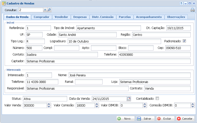 Na aba Dados da Venda nós cadastramos algumas das principais informações, como o interessado e o imóvel.