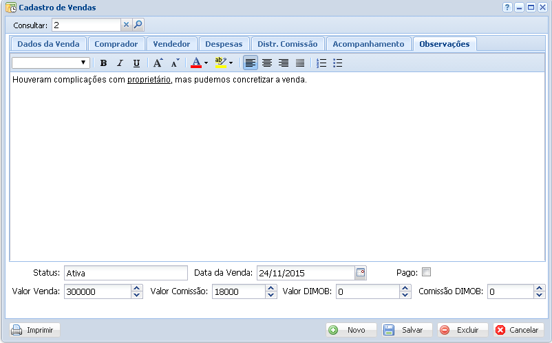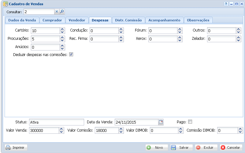 Valor da Venda: Já vem preenchido de acordo com o valor estabelecido no cadastro de Imóveis, mas está aberto a alterações.