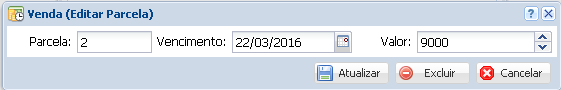Aqui podemos alterar a Parcela, seu Vencimento e o Valor. Para salvar as alterações basta clicar no botão Atualizar, em Excluir caso queira remover esta parcela, ou cancelar para sair da tela de alteração da parcela sem fazer modificações na mesma.