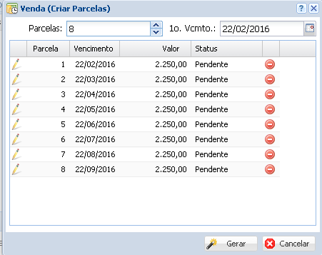 Podemos clicar no ícone de Lápis ao lado de cada parcela gerada, aonde será exibida a seguinte tela: