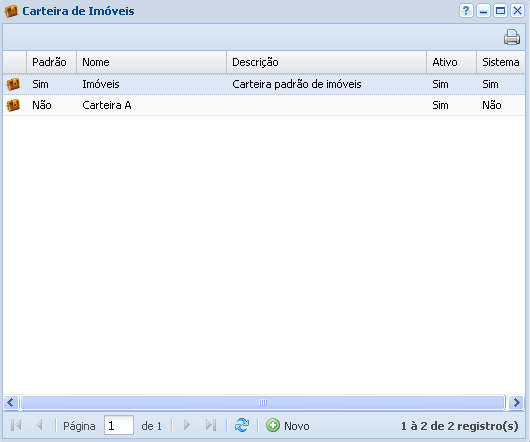 Nesta tela o usuário pode cadastrar e consultar as carteiras dos imóveis desta imobiliária. Para cadastrar uma nova carteira clique no botão Novo.