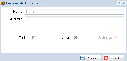 Ao clicar em Novo, o sistema abrirá uma tela para que seja cadastrada uma nova carteira, bastando inserir o Nome e a Descrição, é possível ainda selecionar se esta é uma carteira Padrão do sistema e se ela está Ativa. Para salvar este cadastro clique em Salvar.