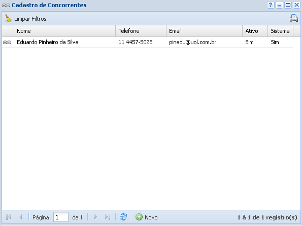 Essa função do sistema permite que o usuário consulte e realize cadastros de seus concorrentes. Para fazer um cadastro de concorrente clique em Novo.