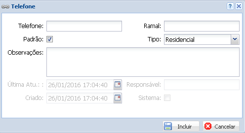 Na aba Telefone insira o número de Telefone, Ramal, Padrão, Tipo e Observações. Para salvar este telefone clique em Incluir.